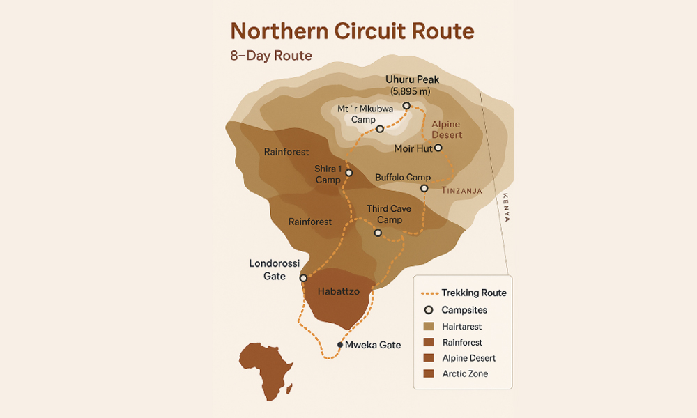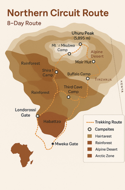The Northern Circuit Route is the longest and most scenic route to the summit of Mount Kilimanjaro. It provides exceptional acclimatization, stunning 360° views, and a high success rate. Afrilion Expeditions offers this immersive 8-day climb for trekkers seeking a quieter, more remote Kilimanjaro experience with top-tier safety and service standards.